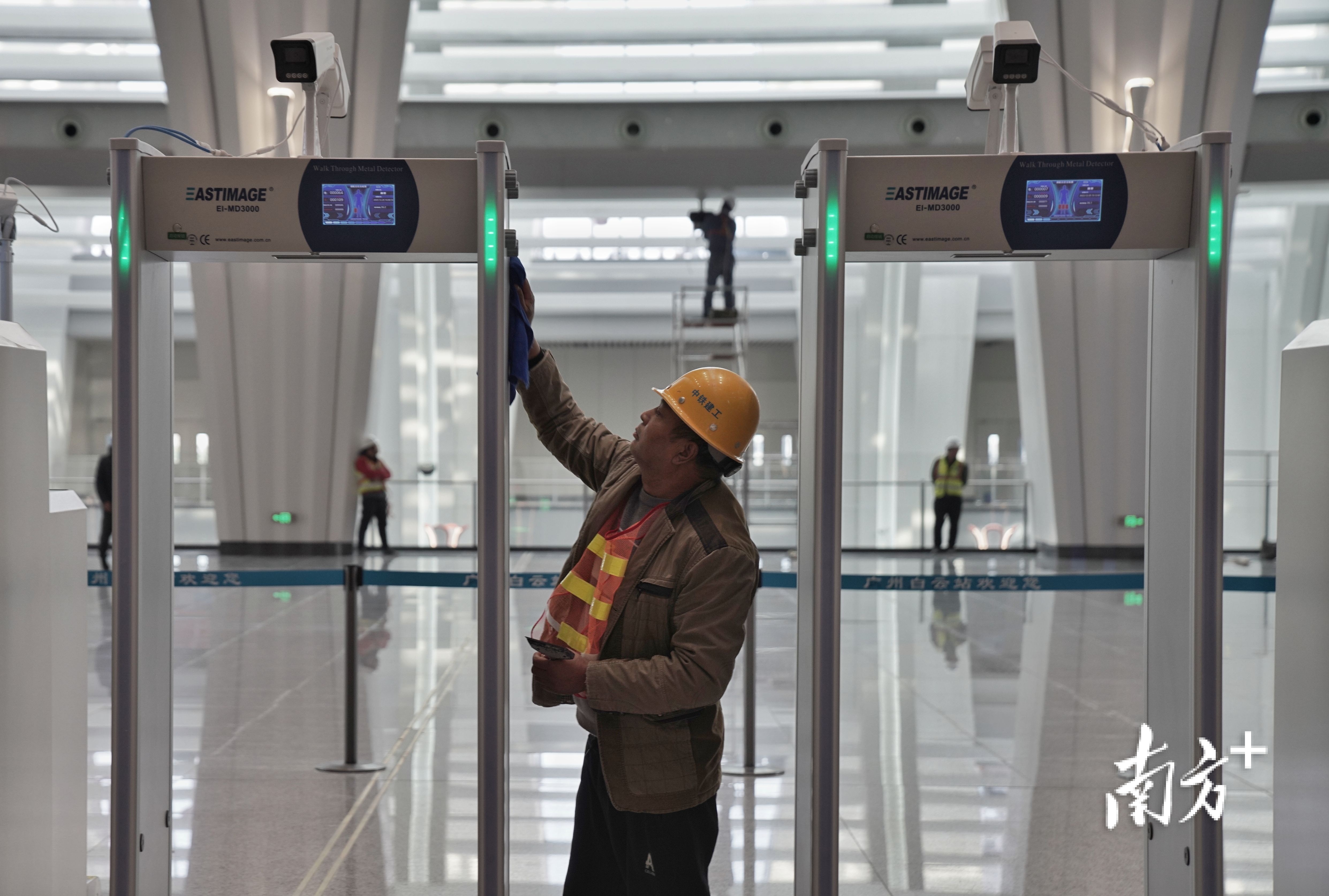 广州白云站通达在即,各项时势已安设收场,工东说念主正在作念终末的清扫责任。