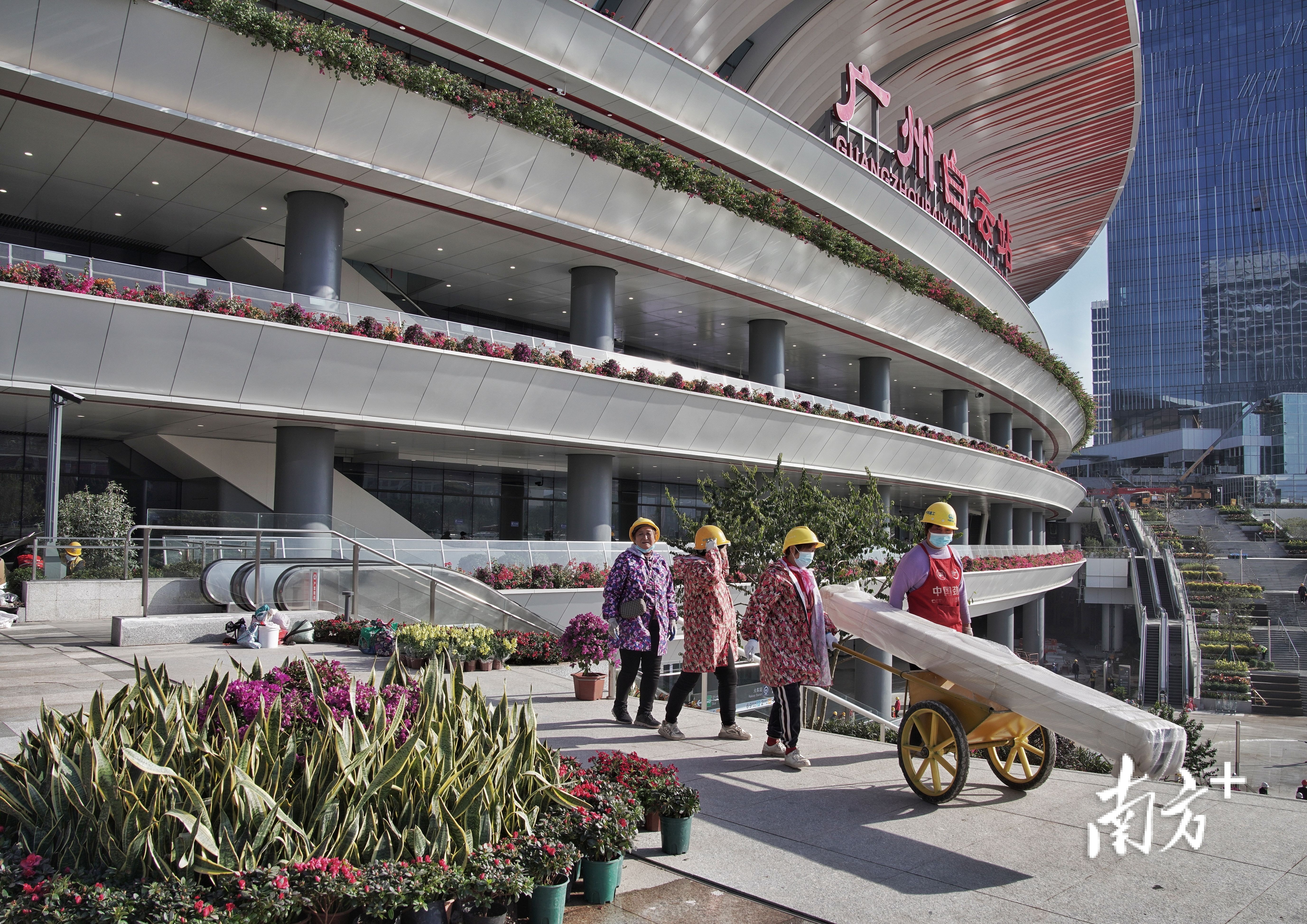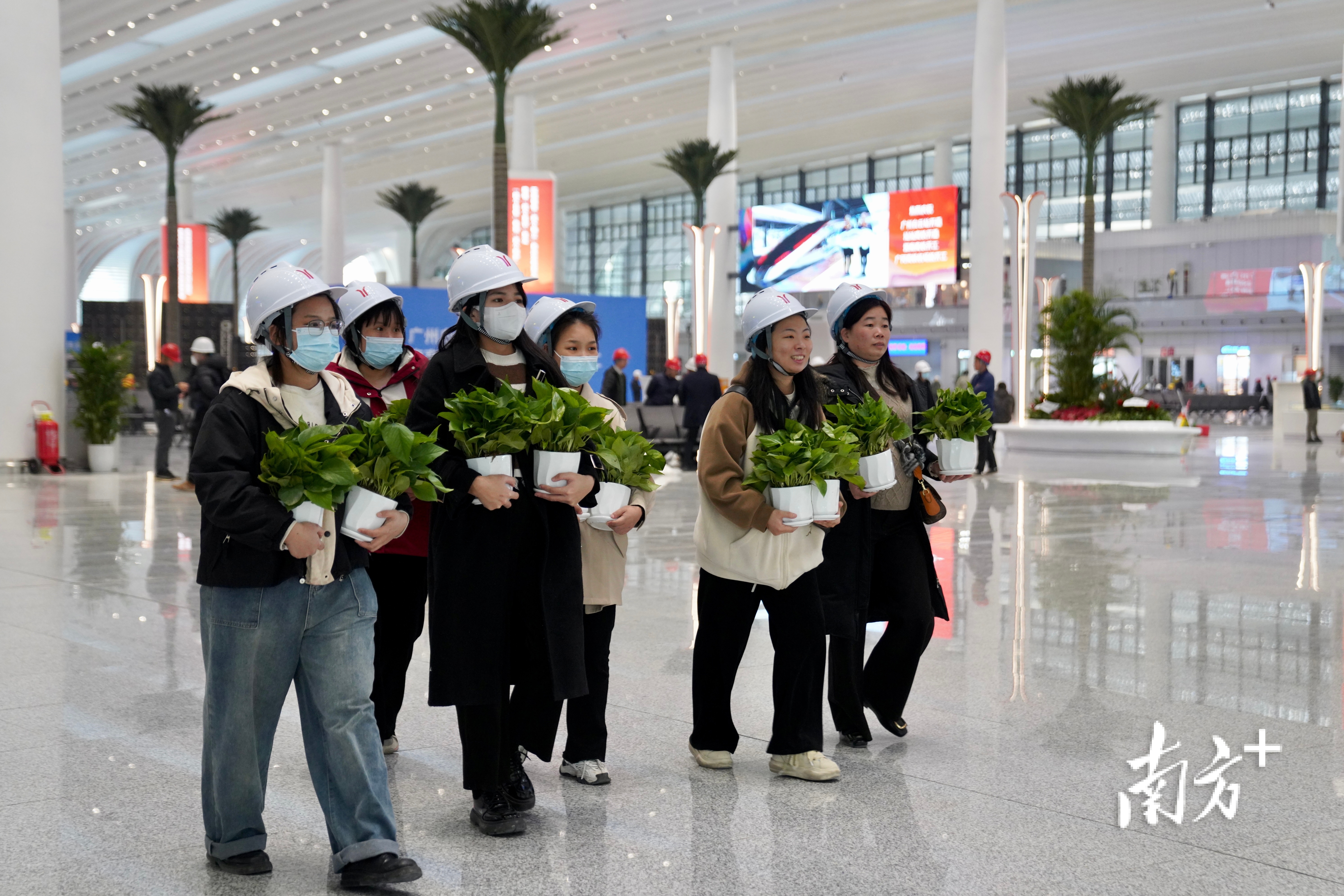 广州白云站行将通车。候车大厅里,责任主说念主员正在搬运绿植。
