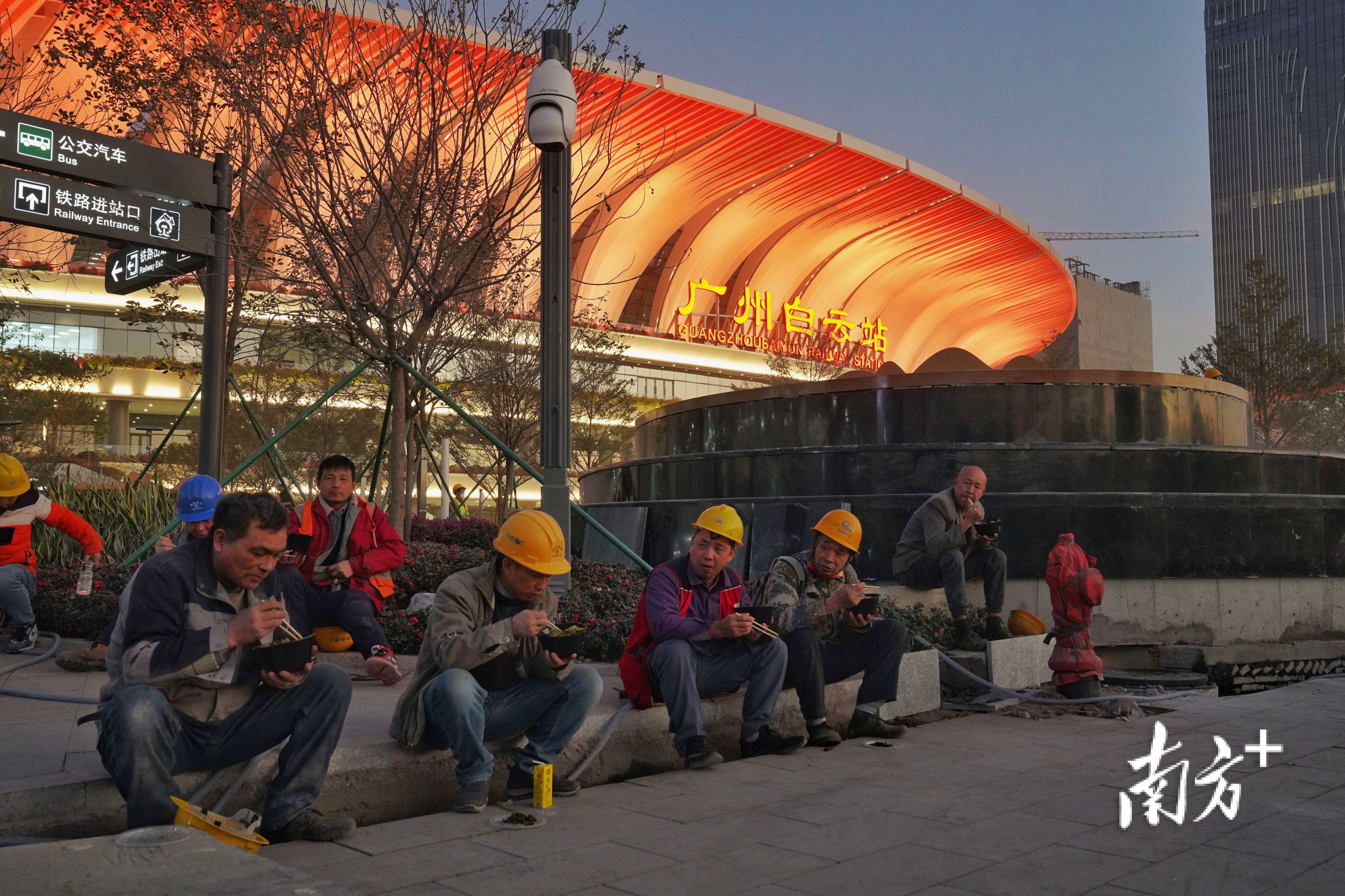 超等工程的背后无边工东说念主沉默付出,广州白云站的秀雅灯光底下,一群工东说念主蹲坐在站前广场吃饭休息。
